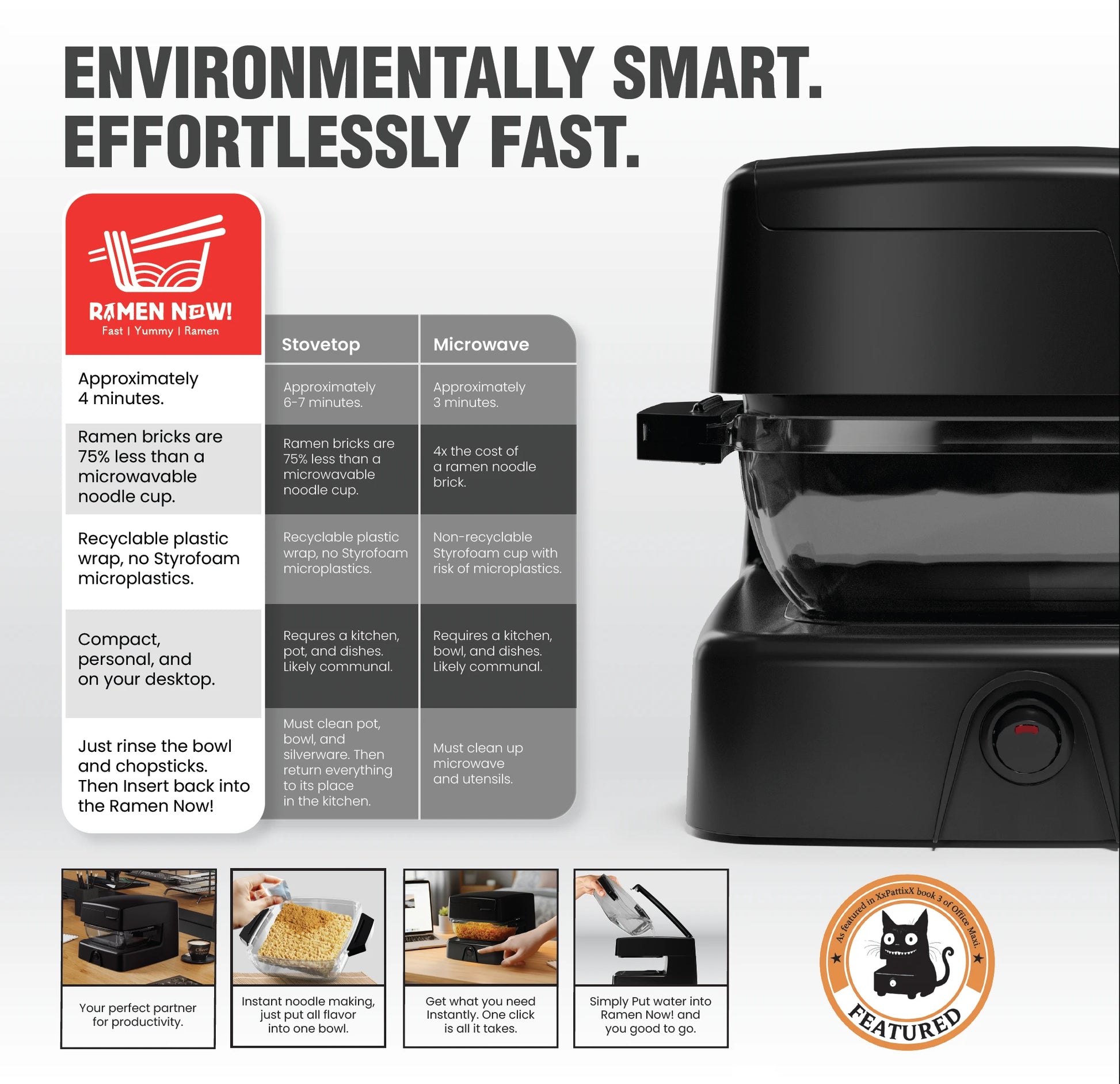 The Ramen Now! is the answer to cleaning dirty pots and pans, fighting toxic waste dump microwaves, getting Styrofoam out of landfills, and eliminating barriers between you and your ramen noodle soup.